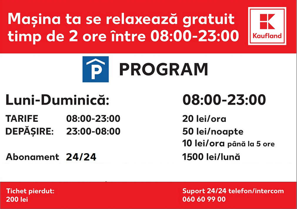 Pentru parcările magazinelor Kaufland Decebal, Testemițanu și Mircea cel Bătrân sunt valabile următoarele tarife: