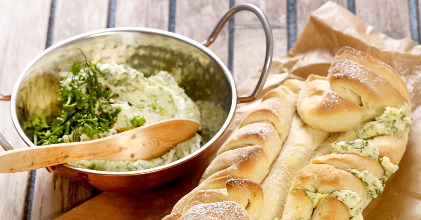 Frecaţi untul până devine spumă, încorporaţi verdeţurile şi asezonaţi cu zeamă de lămâie şi cu sare. După coacere, lăsaţi pâinea să se răcească puţin pe un grătar pentru prăjituri, crestaţi-o, umpleţi crestăturile cu untul şi serviţi.