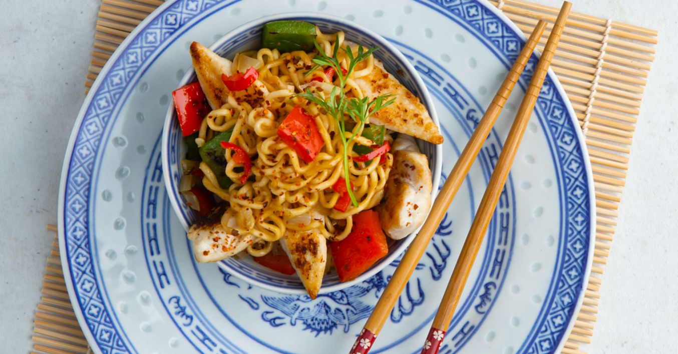 Tăițeii cu ou se prepară conform instrucțiunilor de pe ambalaj. Pieptul de pui se taie fâșii, ardeii se curăță și se spală, cepele se decojesc. Legumele se taie în bucăți mici. Usturoiul se decojește și se presează, ardeiul iute tip chili se taie în jumătăți, i se îndepărtează sâmburii și se toacă fin în cubulețe.