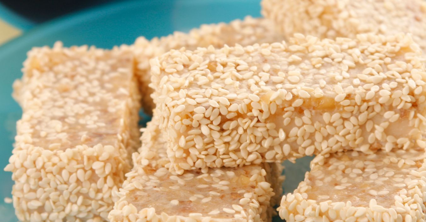 Tapetezi cu folie de plastic o tăviță și întinzi uniform compoziția. Presari deasupra semințele de susan, acoperi cu folie de plastic și presezi ușor, pe toată suprafața, ca să intre semințele de susan în compoziție.