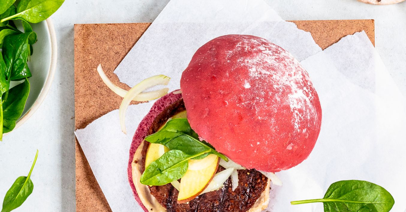 Beyond Burger cu sfeclă roșie, măr și sos de alune caju