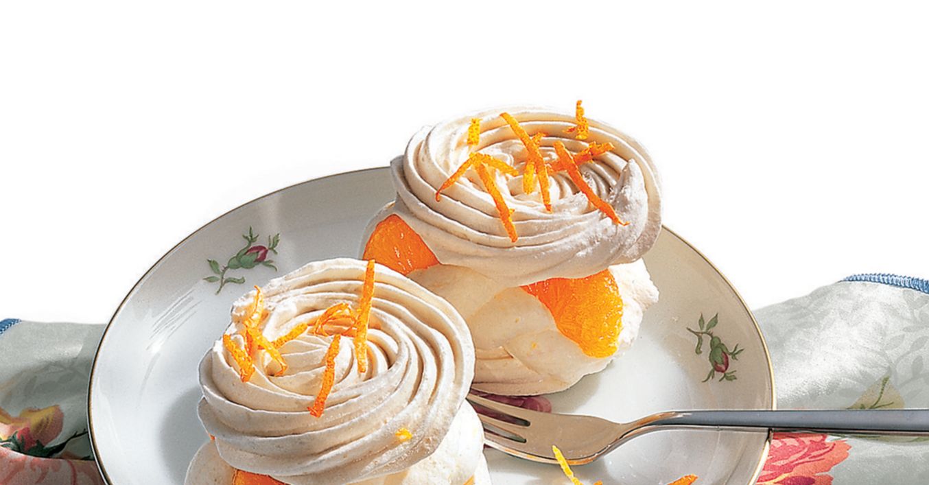 Se scurg mandarinele pentru umplutură. Se bate spumă frișca, adăugând cele 2-3 linguri de zahăr rămase, zeama și coaja de portocale și întăritorul. Se toarnă frișca într-un cornet cu șpriț. Se umplu jumătate din bezele cu un strat de frișcă. Deasupra se așază feliile de mandarină și se acoperă cu celelalte bezele. Se ornează cu coajă de portocală și se servesc imediat.