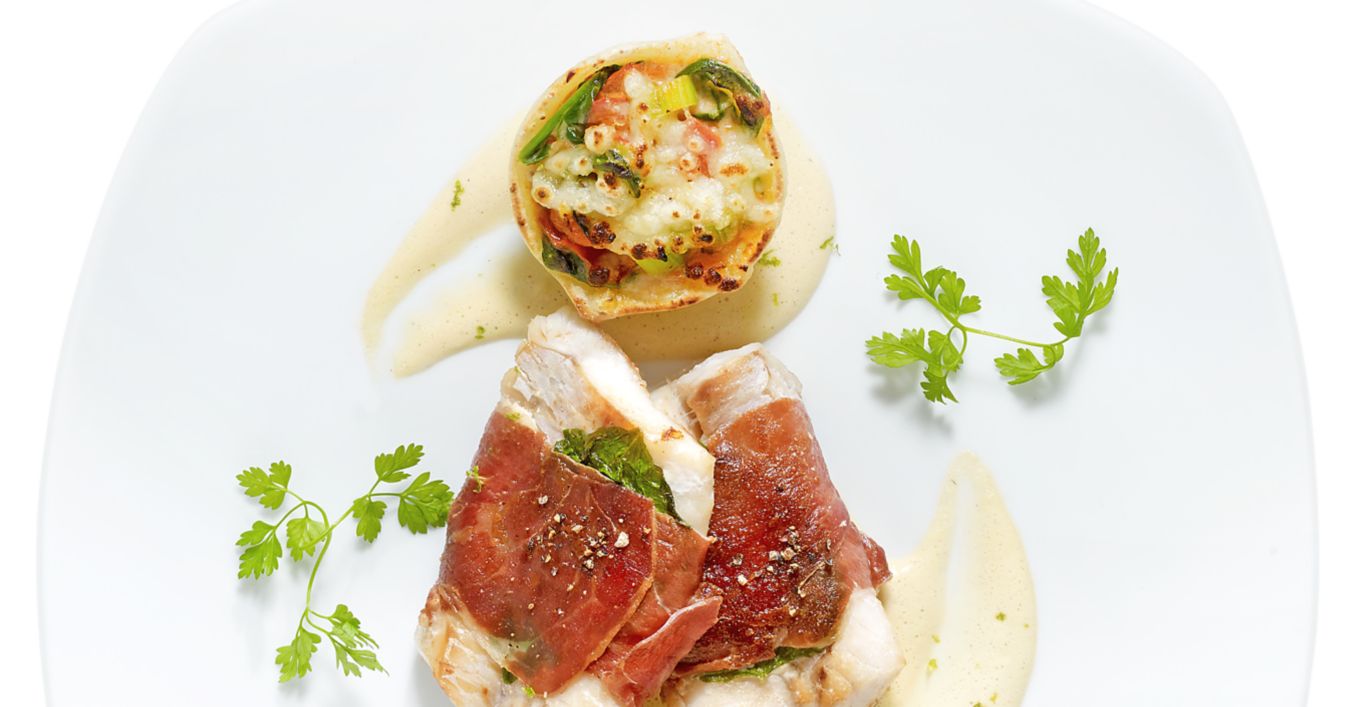 Peștele se spală, se usucă, se condimentează cu sare și piper, se presară cu roiniță, se înfășoară în șunculiță și se prăjește 5-8 minute în uleiul încins rămas de la legume. Peștele, pastele umplute și sosul olandez cu limetă se așează în farfurii și se servesc calde.