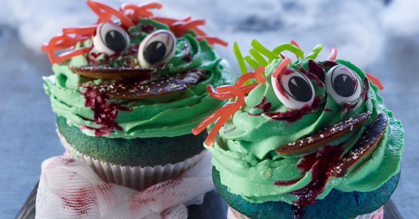 Amestecaţi crema de brânză, untul şi zahărul pudră şi coloraţi amestecul în verde cu colorant alimentar. Puneţi crema într-un poş cu vârf în stea şi şpriţaţi-o pe brioşe ca şi „capete de monştri“.