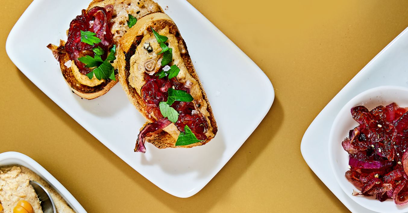 Feliile de baghetă se ung cu hummusul cu scorțișoară și se așază deasupra ceapa caramelizată. Se presară pătrunjel, sare, piper și se servesc.