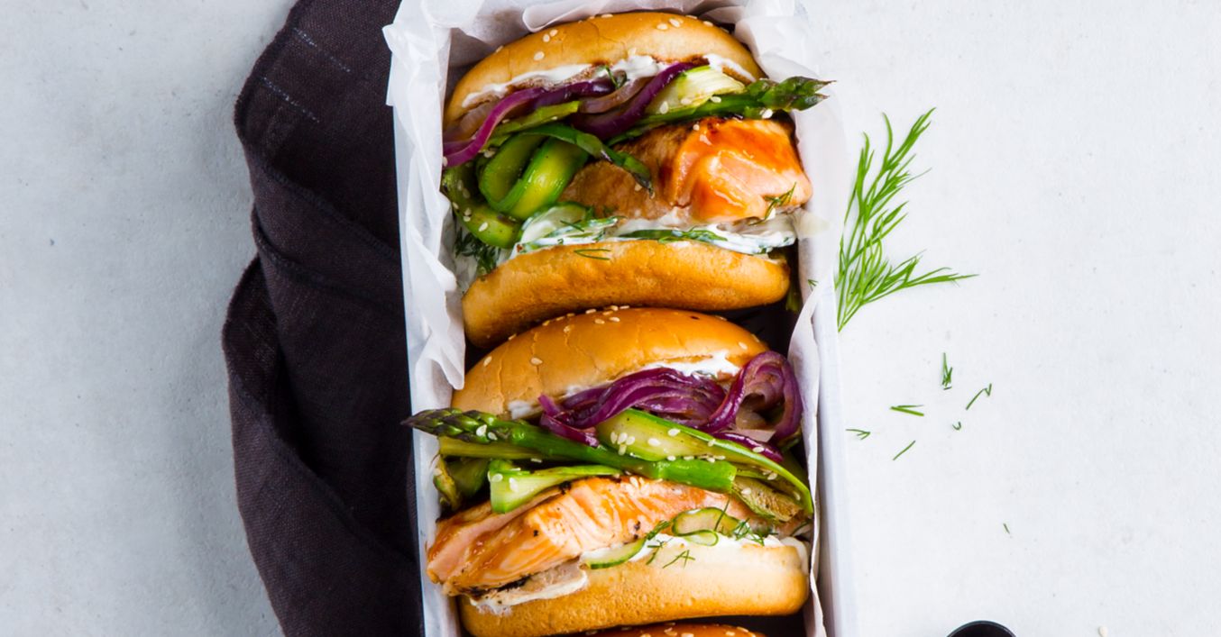 Chiflele se taie pe jumătate și se rumenesc scurt la grătar. Chiflele se ung mai întâi cu unt, apoi se distribuie somonul pe jumătățile de chifle. Sparanghelul prăjit se așază pe acestea și apoi se distribuie ceapa pe deasupra. Se acoperă cu capacele de la chifle.