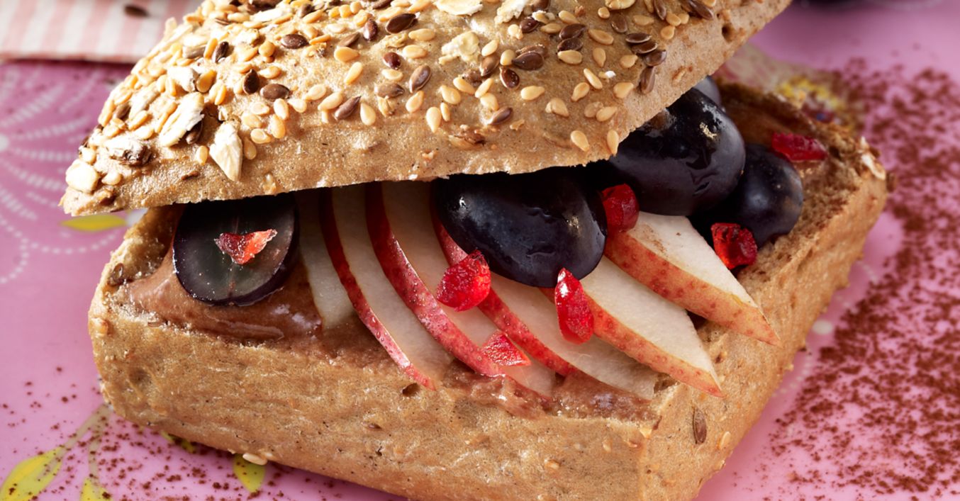 Puneți pe jumătățile inferioade ale pâinicilor fâșii de pere și struguri și tartinați cu cireșe. Acoperiți cu jumătățile superioare ale pâinicilor și serviți.