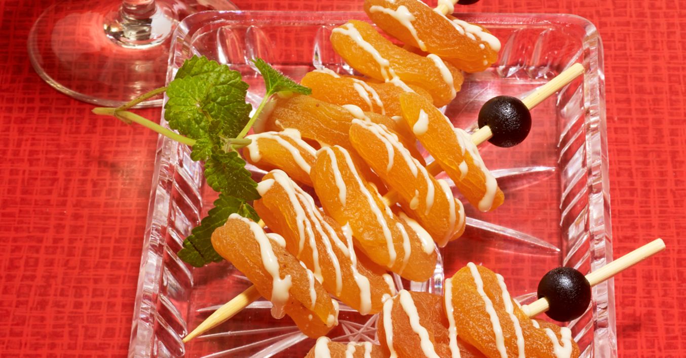 Taie ciocolata de menaj și topește-o într-o baie de apă fierbinte. Caisele usucă și se așează pe frigărui și se stropesc cu acoperire, se lasă să se usuce și se servesc ornat cu struguri de culoare închisă, dacă se dorește.