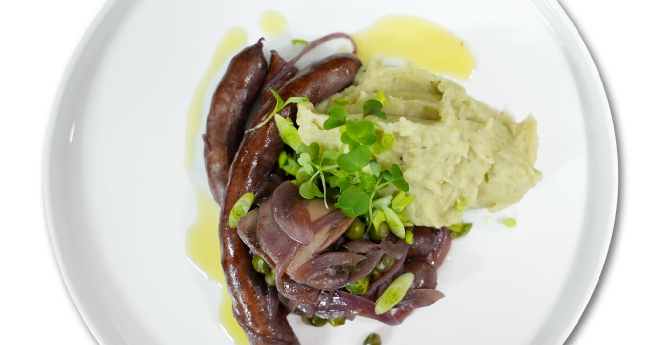 Cârnați de porc cu pastă de cartofi și legume
