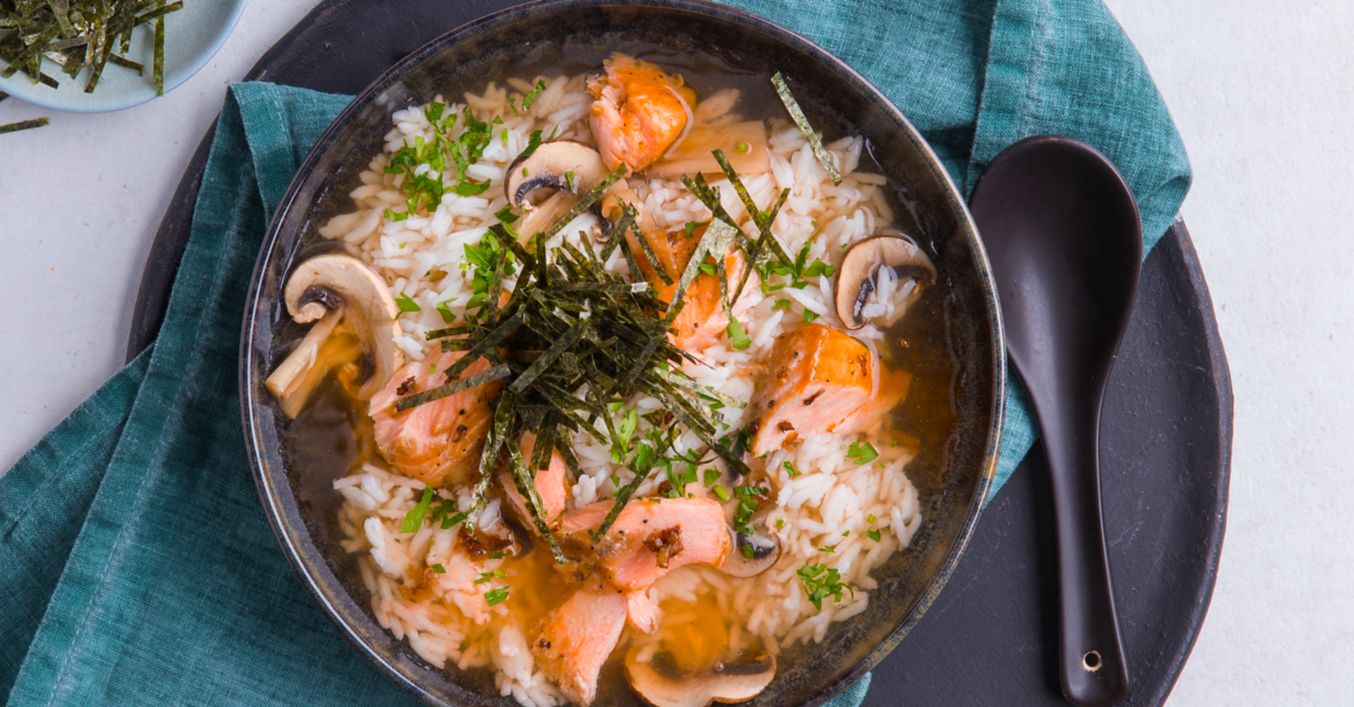 Se taie mărunt algele nori. Se curăță ciupercile, se taie în felii subțiri, se adaugă în supă împreună cu nori și se dă în clocot pentru puțin timp. Supa se condimentează cu zeama de limetă, sosul de chili și cu sosul de soia rămas și se toarnă în farfurii. somonul se rupe bucăți, se distribuie în farfurii, se presară pătrunjel pe deasupra și se servește.