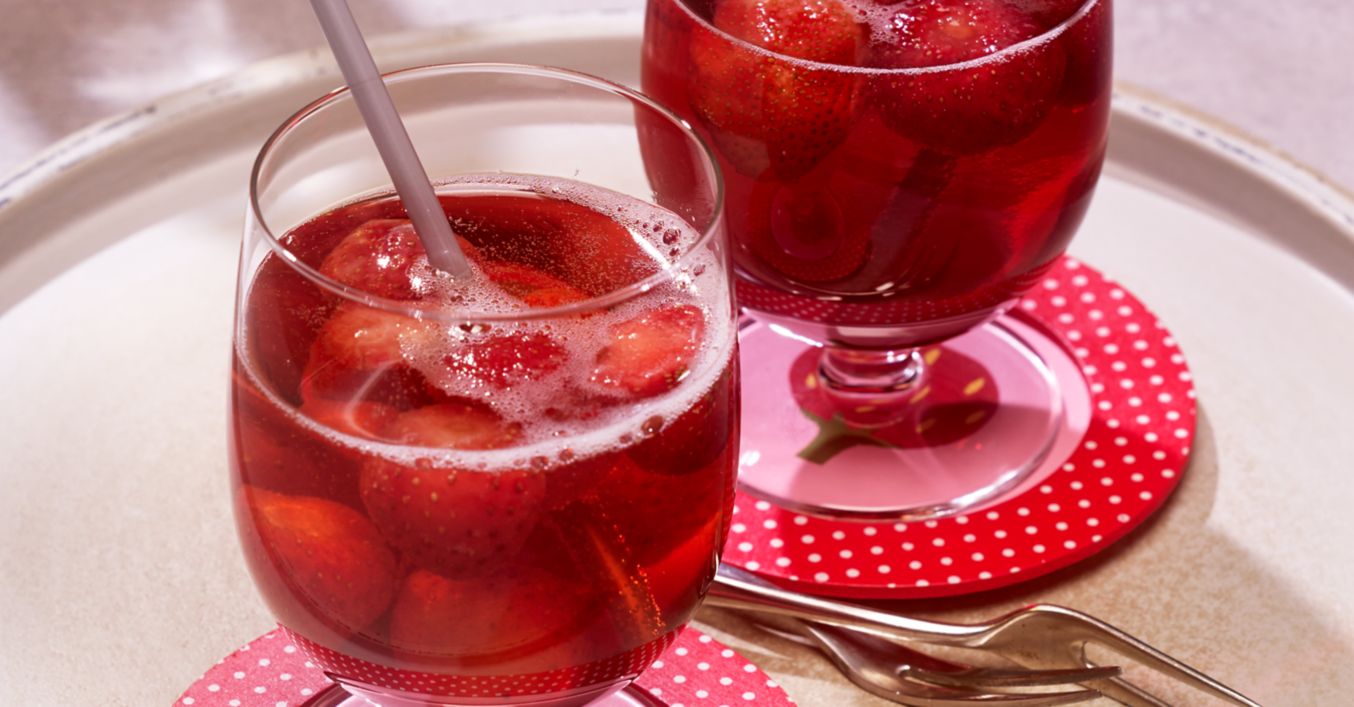Căpșunile se distribuie în pahare, apoi acestea se umplu cu vin și șampanie și se servește.