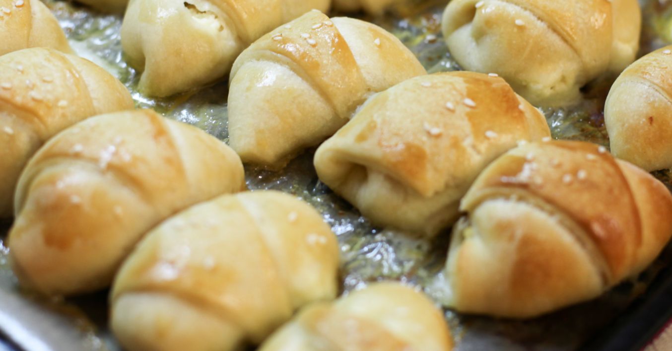 După ce și-a dublat volumul, se pune aluatul pe blatul de lucru. Se întinde o foaie de 3 mm grosime. Se freacă 50 g de unt cu 25 g zahăr, iar cu acest amestec se unge toată foaia de aluat. Se taie pătrate cu latura de 8 cm. Fiecare pătrat se taie în triunghiuri. Se rulează cornurile și se pun în tava unsă cu unt. Se mai lasă 10 minute la crescut.