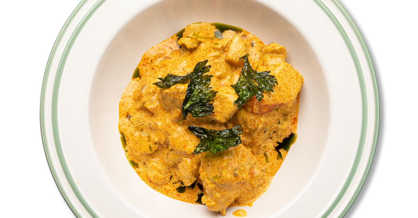 Cotletul, se spală cu apa la temperatura camerei și se taie cubulețe. Ceapa se toacă după preferință, mărunt sau julien. Într-o tigaie non-aderentă se topește un cub de unt, se adaugă puțin ulei și se încing bine. După ce acestea au ajuns la o temperatură optimă, carnea se rumenește pe toate părțile și se asezonează cu sare și piper, după gust. Se adugă usturoiul mărunțit și pasta curry și după se amestecă pentru 5 minute continuu. Se adaugă iaurtul și se omogenizează preparatul, alături de pasta de roșii și sare și piper dacă se mai consideră necesar.