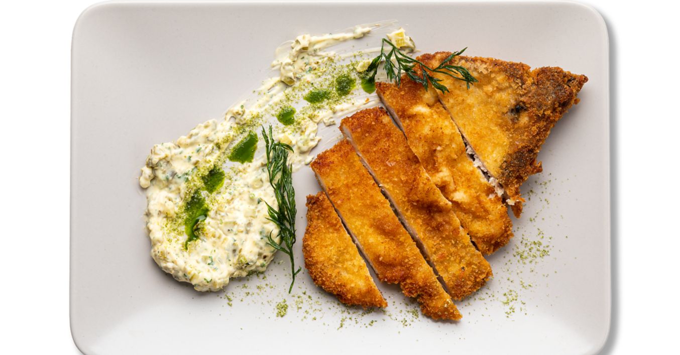 Pe o frunză de salată se montează Cotletul de porc și sosul tartar și se servesc de preferat calde.