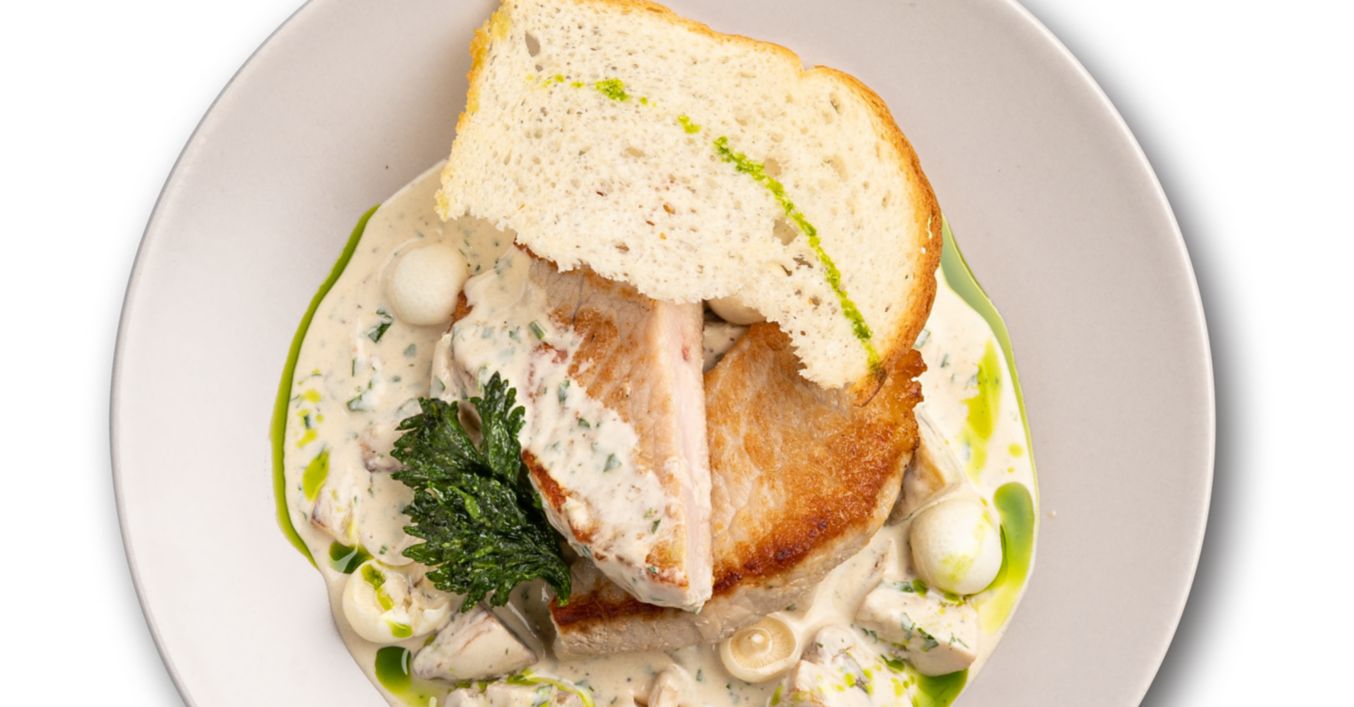 Cotletele de porc se montează în sosul de smântână alături de ciuperci, pe deasupra picurându-se uleiul de măsline presărat cu patrunjel verde și se servesc alături de legumele gătite lângă friptură. Pentru un plus de savoare se poate servi cu o felie de pâine prăjita.
