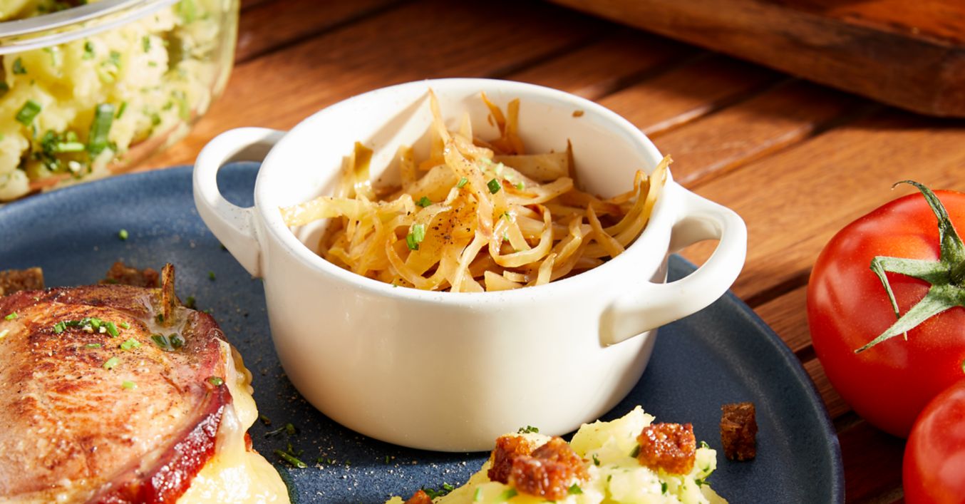 Cartofii se curăță, se spală și se fierb în apă clocotită cu sare, aproximativ 20 minute. Între timp, se curăță cepele și varza și se taie în fâșii subțiri. Ambele se călesc într-o oală cu 1 lingură de ulei, aproximativ 2 minute. Se adaugă zahărul și se lasă puțin să se caramelizeze, apoi se stinge cu oțet și se lasă să se înăbușe, cu capacul deasupra, la foc mic, aproximativ 10 minute. La final se condimentează cu sare și piper și se păstrează calde.