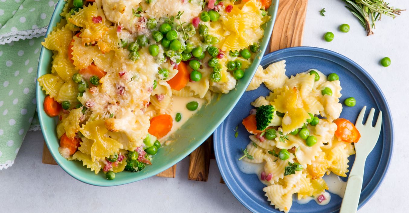 Farfalle carbonara cu legume la cuptor