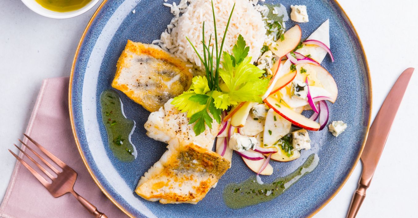 Fileurile de șalău se stropesc cu restul de suc de lămâie, se aranjează împreună cu salata din mere și țelină și cu orezul, servindu-le cu restul ierburilor deasupra.