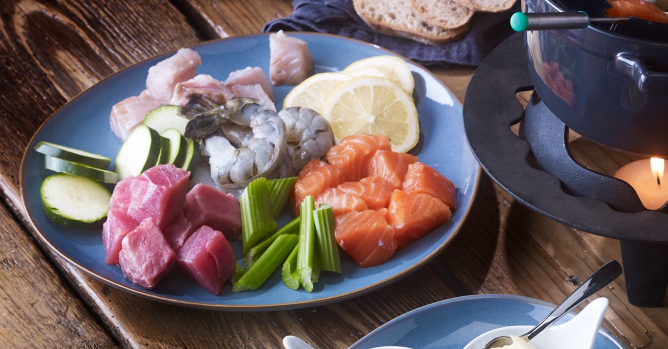 Se înfig alternativ peștele, lămâia și legumele alternativ în furculițele de fondue.