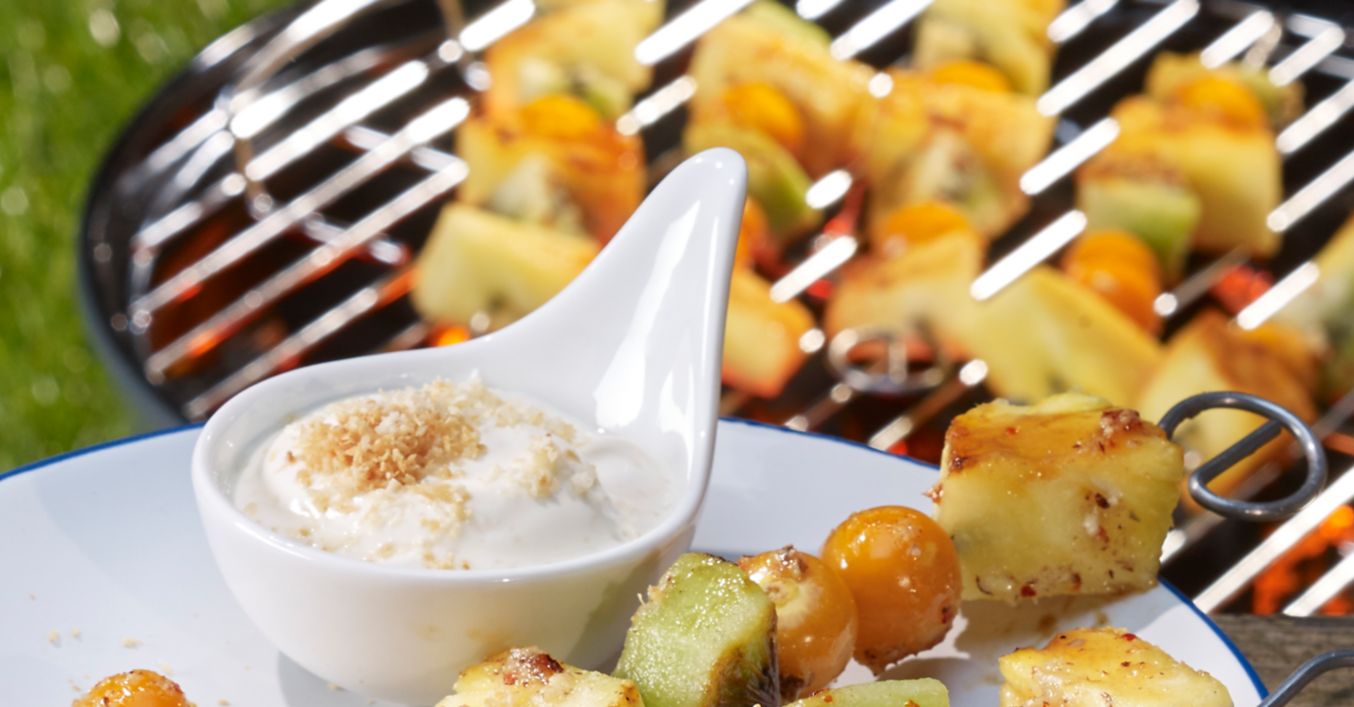 Cocosul ras se prăjește într-o tigaie de teflon, se amestecă cu iaurtul, zahărul și lichiorul. Frigăruile se coc la grătar, se așează cu sosul în farfurie și se servesc.