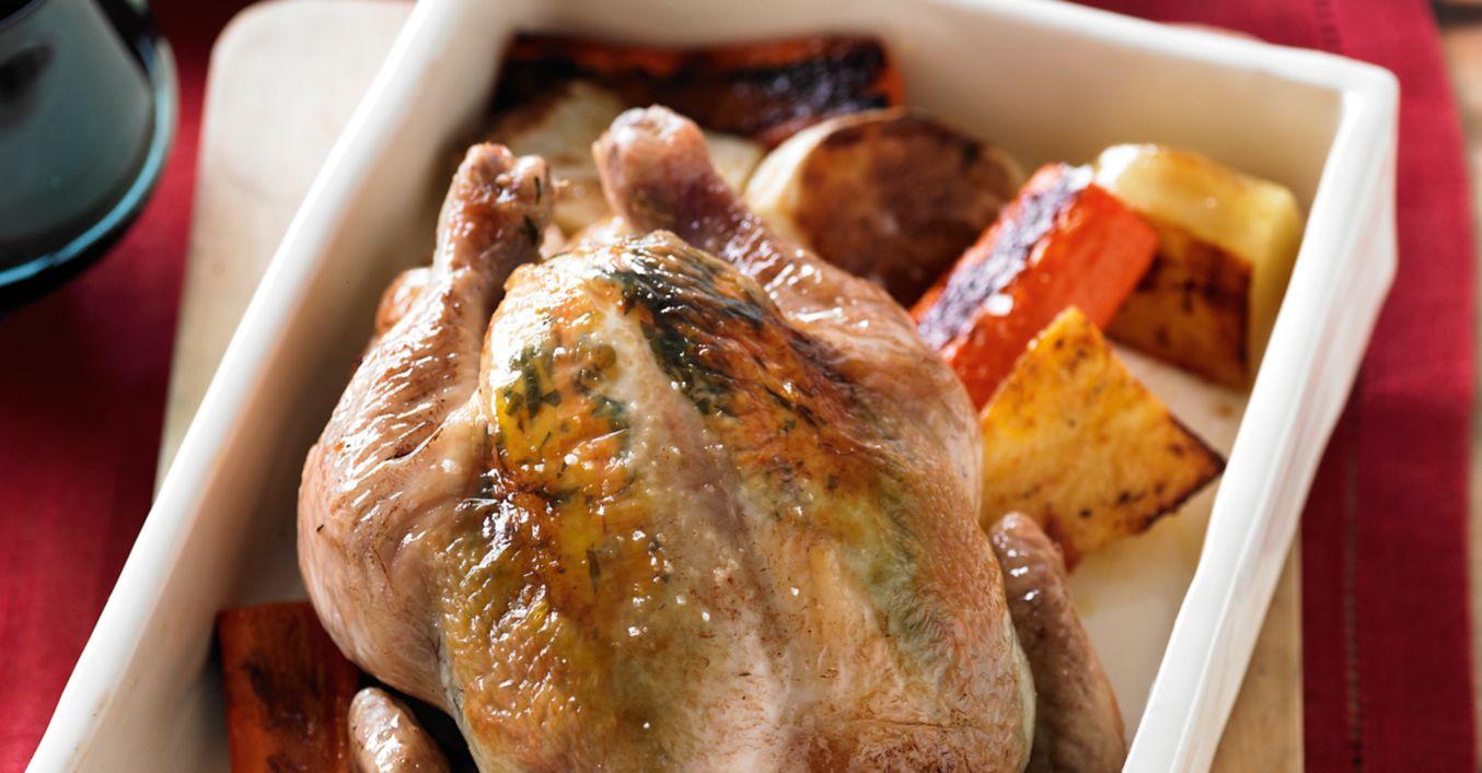 Se așază puii în tavă, cu legumele. Se pun la cuptor 30-35 de minute, sau până ce sucul cărnii e limpede când se înțeapă pulpa puiului.