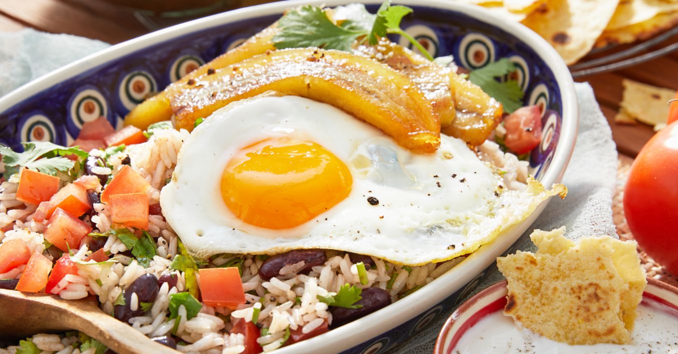 Se încinge 1 linguriță de ulei în tigaie și se prăjesc ouăle ochiuri în aceasta, condimentând cu sare și piper. Se adaugă fasolea și roșiile la orez, se condimentează cu sare, piper și sucul de lămâie verde și se presară coriandrul.