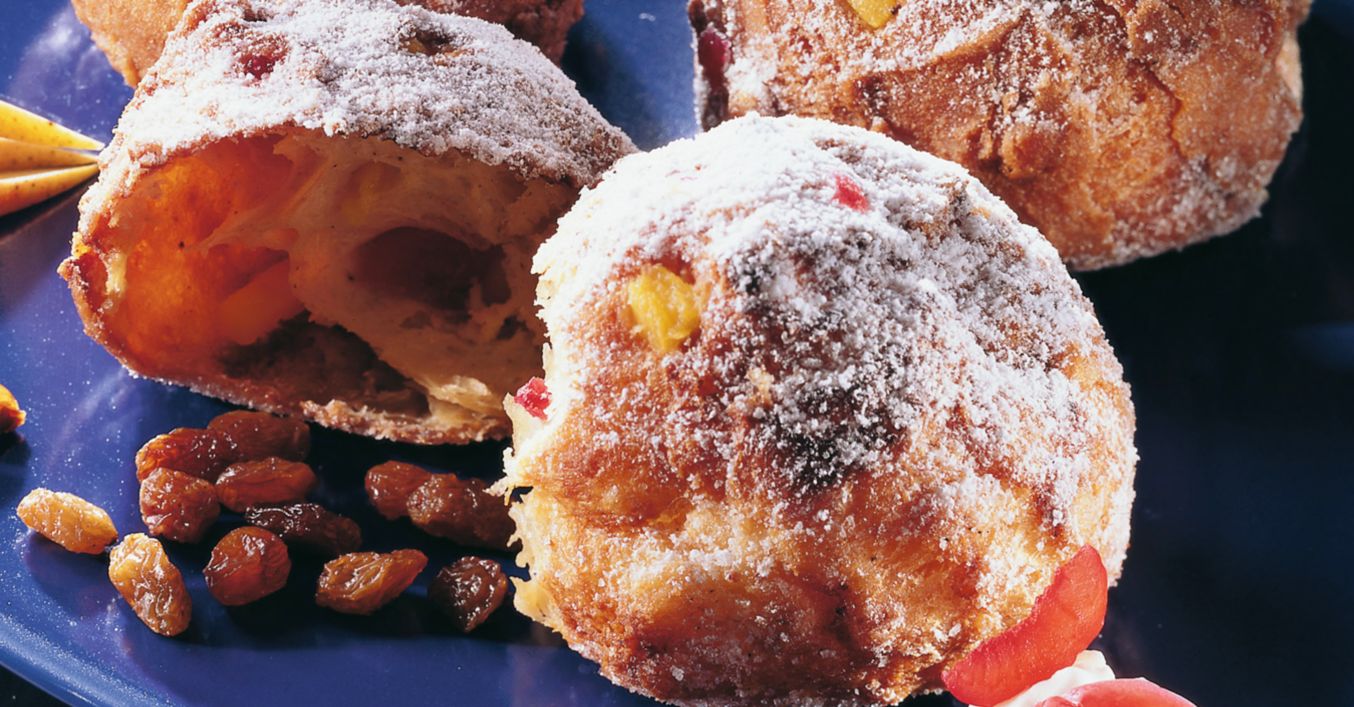 Cireșele și feliile de ananas se taie mărunt și se frământă cu grijă în aluat împreună cu coacăzele. Încălzește uleiul într-o friteuză la 175 de grade, scoate gogoșile cu două linguri și prăjește în grăsime fierbinte până se rumenesc, scurge și rulează în zahăr.