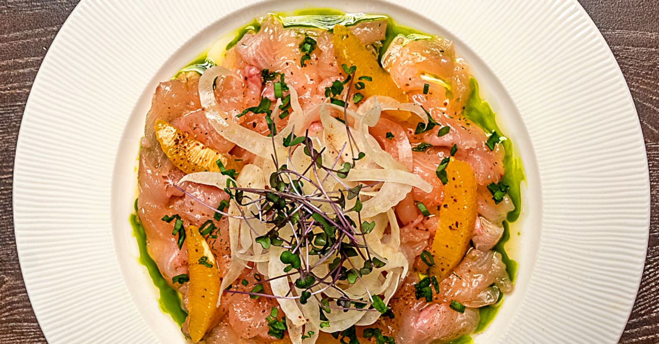 Se pregătește un mix de salată cu fenicul, pulpă de portocală, microplante și ulei după gust.
