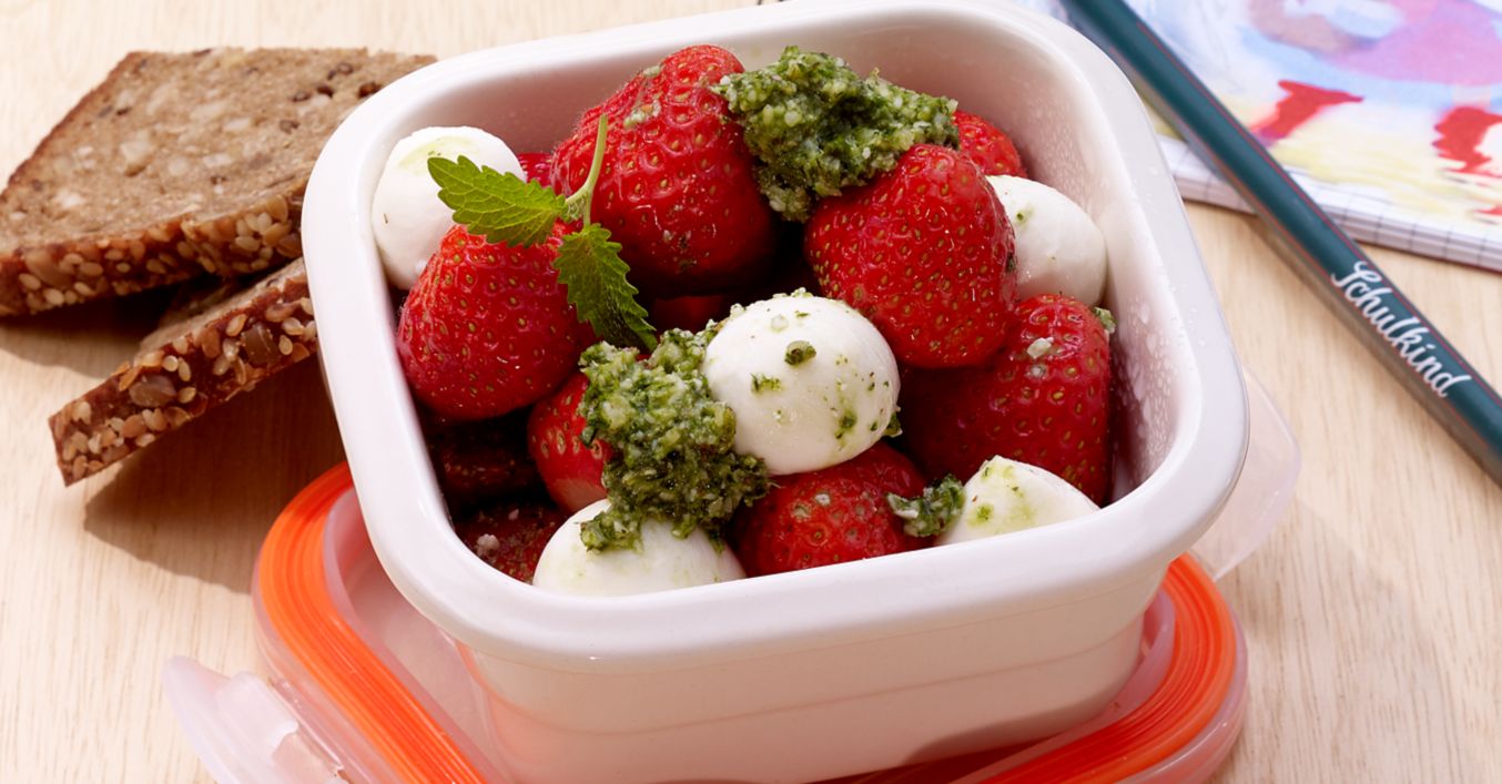 Spălați ierburile aromate pentru Pesto, tăiați-le foarte fin și amestecați-le cu zahăr, suc de portocale și migdale. Amestecați căpșunile, buletele de Mozzarella și Pesto și ambalați împreună cu pâinea integrală la pachet.