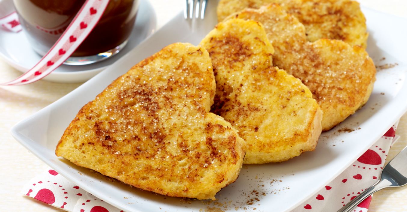 Din feliile de pâine albă se decupează inimioare mari. 125 ml lapte și ouă se amestecă, se înmoaie inimioarele în acestea și se rumenesc în untul încins, pe ambele părți.
