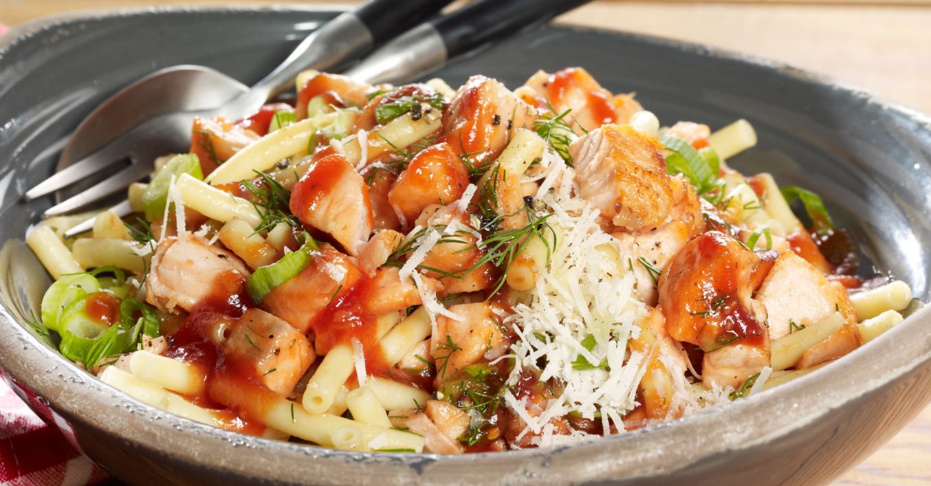 Macaroanele se fierb în apă cu sare fierbinte aprox. 10 minute. Sosul se rafinează cu mărar și se condimentează cu sare, piper și zahăr. Se adaugă bucățile de somon și se fierb scurt.