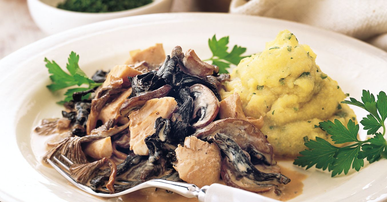 Mămăligă cu curcan și sos de ciuperci de pădure