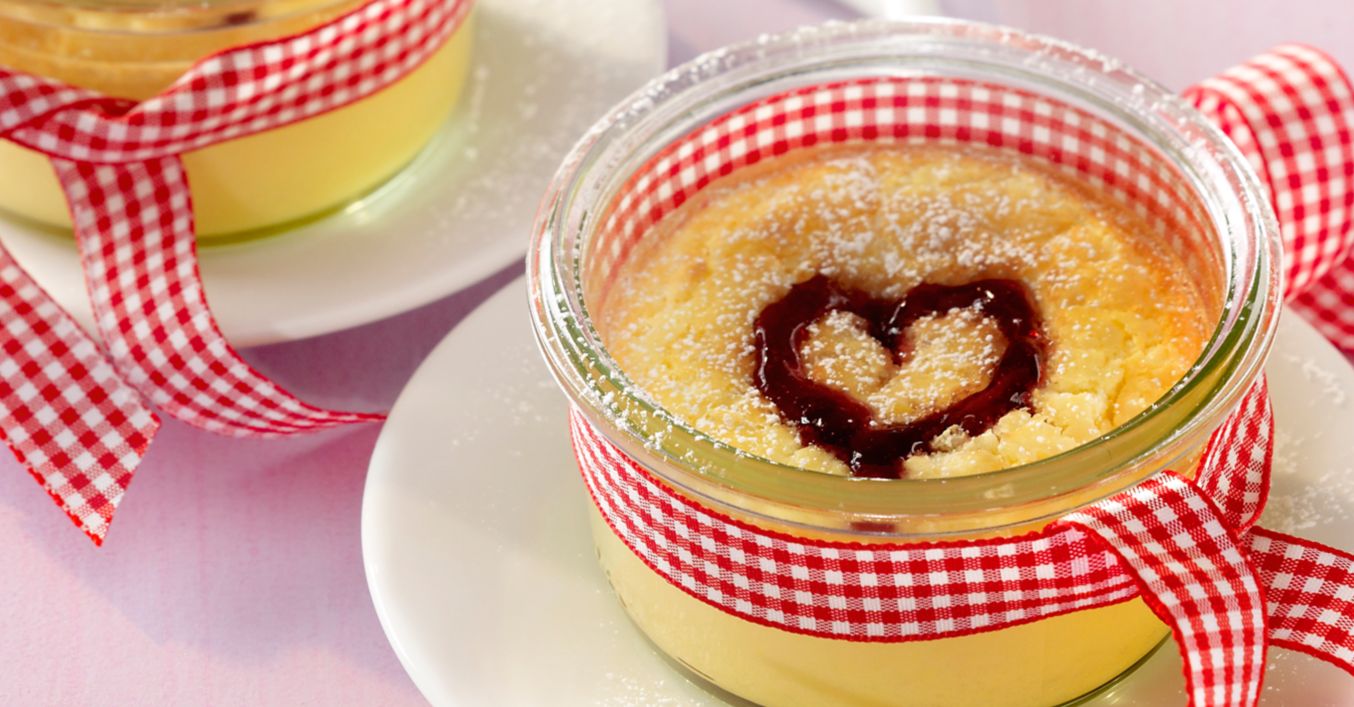 Brânza proaspătă se amestecă cu ouăle, zahărul și praful pentru budincă de vanilie și se distribuie în pahare mici.