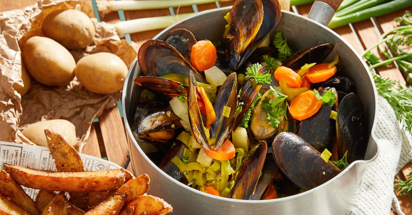 Între timp, se curăță, respectiv se decojesc legumele, se spală și se scurg, apoi se taie în bucăți mici. Midiile se curăță, aruncându-le pe cele deschise. Untul se încălzește într-o cratiță, se adaugă legumele și se înăbușă aproximativ 2 minute, întorcându-le de pe o parte pe alta. Se adaugă supa și berea, se lasă să dea în clocot, apoi se condimentează cu sare și piper. Se adaugă midiile și se lasă să fiarbă, cu capac deasupra, aproximativ 15 minute, la foc mic.