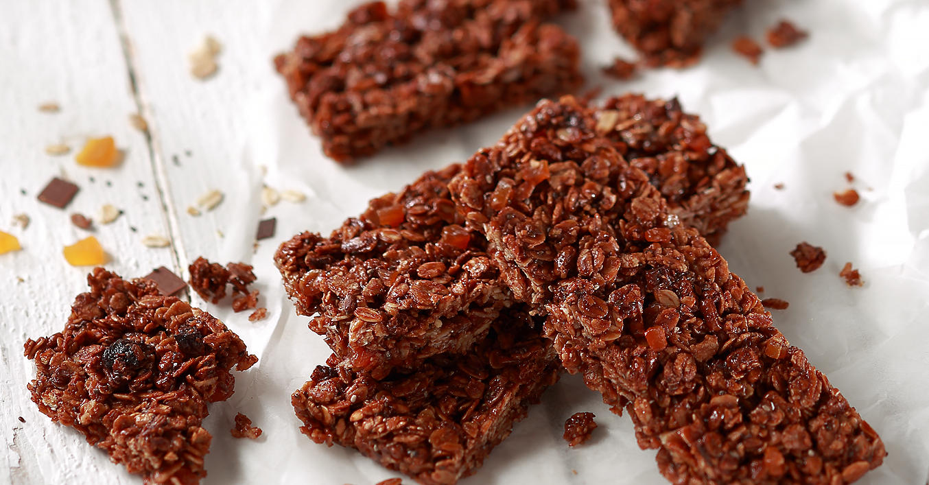 Se toacă mărunt caisele și se amestecă cu musli, fulgii de cocos, semințele de in și semințele de chia. Se caramelizează zahărul într-o tigaie acoperită până devine maro auriu, se adaugă aproximativ 60 de mililitri de apă și se amestecă până se omogenizează. Adăugați miere și ulei de cocos, amestecați și fierbeți timp de 1-2 minute. Se toarnă amestecul de zahăr peste amestecul de muesli, se amestecă bine și se întinde cu o grosime de 1 până la 2 centimetri pe o tavă de copt tapetată cu hârtie de copt.
