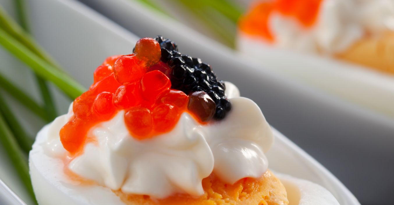 Pe fiecare jumătate de ou se pune puțină maioneză și se ornează cu icre caviar, roșii și negre.