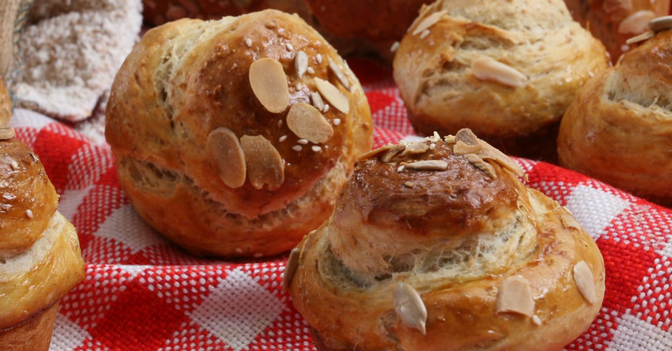 Când aluatul a crescut, formezi pâinișoare pe care le pui în tava unsă cu ulei și le lași să mai crească la cald, timp de 20-30 de minute. Le ungi cu oul bătut împreună cu 2-3 linguri de lapte, presari deasupra semințe și le coci în cuptorul preîncălzit, la foc mediu, 35-45 de minute.