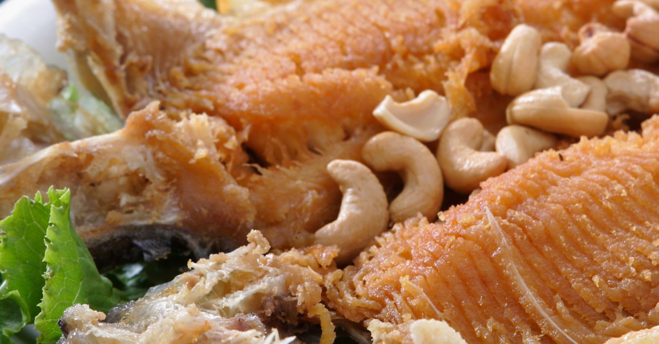 Se scoate pe un pat din frunze de salată și se ornează cu boabe de caju și lămâie.
