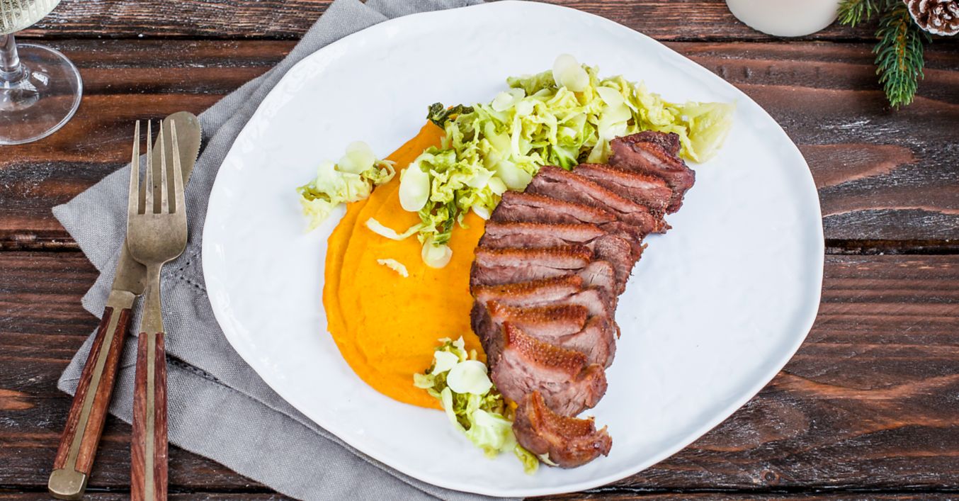 Piept de gâscă cu varză caramelizată și piure de dovleac