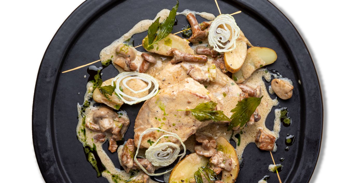 În paralel, cartofii noi se blansează cu ulei de măsline, sare și piper. După ce sunt gata, se încorporează în sosul de ciuperci și preparatul se servește cu pătrunjel proaspăt tocat și fâșii de castraveți murați pe deasupra.
