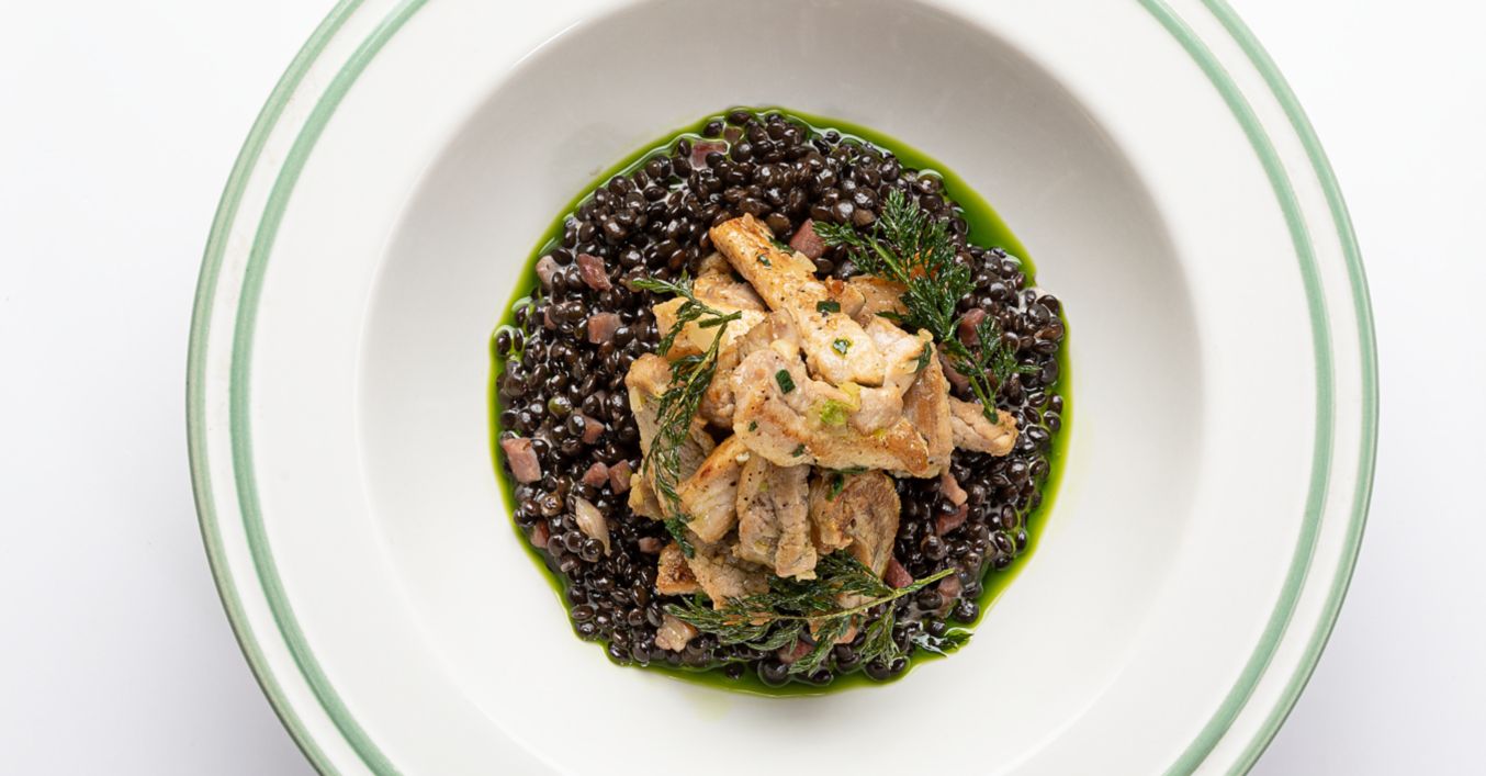 În paralel, lintea se spală și se fierbe în apă în care s-a adăugat sare, până când devine al dente. Aceasta se strecoară și se pune deoparte. Într-o tigaie, ceapa tocată mărunt alături de un cub mic de unt se călește până devine transparentă, se adaugă lintea și puțină apă caldă si puțin parmezan și se amestecă până compoziția devine omogenă. Se mai adaugă puțină apă caldă și parmezan și se repetă procedeul până se termină ingredientele sau se ajunge la cantitatea dorită, se Adaugă la final smântână lichidă pentru un preparat cremos care se servește lână pieptul de porc preparat mai devreme, de preferat de tăiat fâșii.