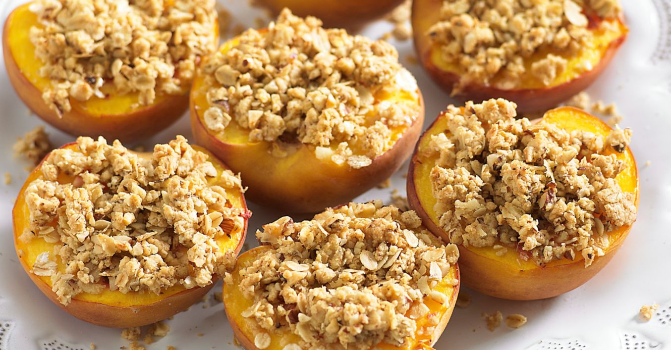 Se așază în tava de copt piersicile tăiate în jumătăți, pe partea cu coajă. Se presează mixtura cu alune pe suprafața fiecăreia, apoi se coc 12-15 minute sau până când fructele sunt fragede, iar toppingul s-a rumenit.