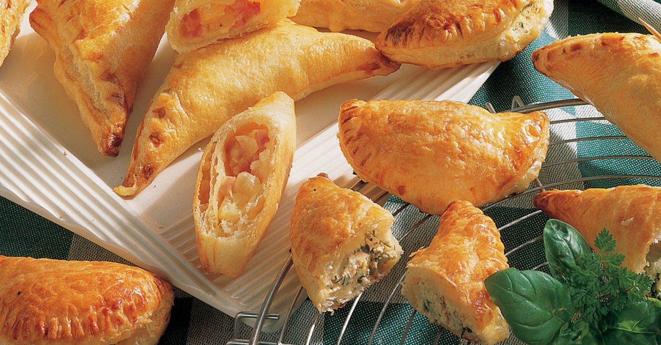 Se întinde o foaie subțire de aluat și se taie în 12 pătrate de aproximativ 12 cm. În mijlocul fiecărui pătrat se pune câte o linguriță de brânză cu verdețuri.