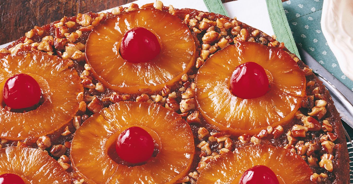 Se coace la 190°C, timp de 30-35 minute sau până ce o scobitoare înfiptă în mijlocul compoziției este extrasă curată. Se lasă 10 minute înainte de a o răsturna pe un platou. Se pune câte o cireașă în mijlocul feliilor de ananas.
