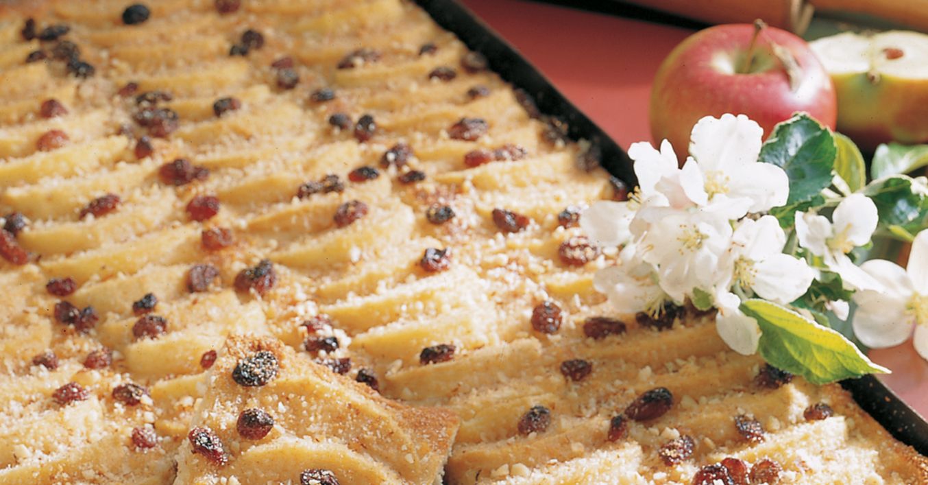 Se fărâmițează pesmeții și se rumenesc. Se presară peste aluat, împreună cu stafidele sau cu fructele uscate și mărunțite. Se mai lasă aluatul 20 de minute. Se amestecă scorțișoara, restul de zahăr și alunele tocate și se presară deasupra. Se coace prăjitura circa 55 de minute în cuptorul încins în prealabil.
