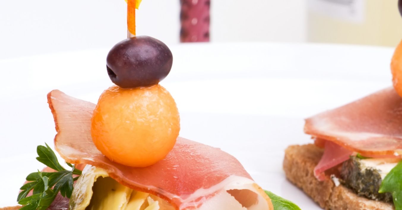 Cu ajutorul unor scobitori se înfig câteva roșii cherry și apoi câteva măsline.