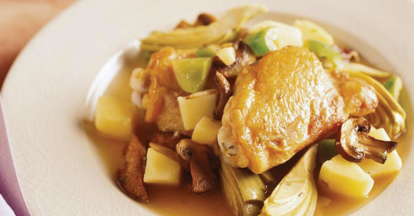 Se încorporează în compoziție ciupercile. Se acoperă caserola și se gătește totul, amestecând ocazional, timp de 5 minute sau până când ciupercile încep să lase zeamă. Se adaugă supa-bază, anghinarea, jumătate din sare și tarhonul; se dă în clocot. Se aduce puiul înapoi în caserolă și se clocotește din nou. Se acoperă vasul, se introduce în cuptor și se coace preparatul 35 de minute sau până ce puiul și cartofii sunt fragezi.