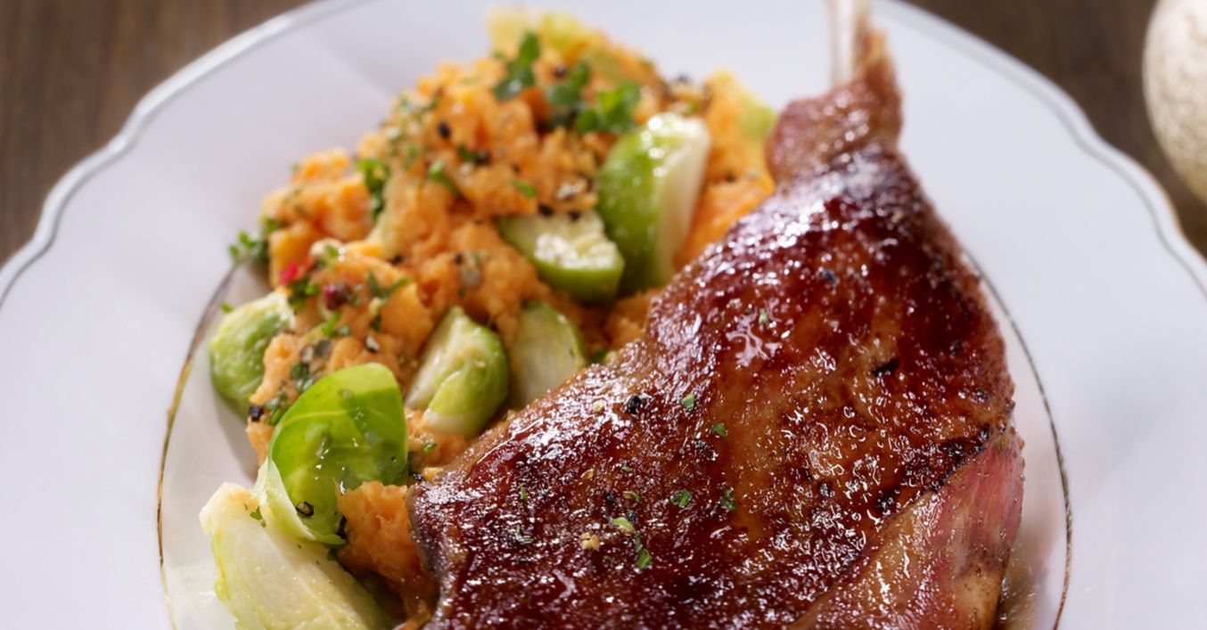 Se degresează sosul lăsat de pulpele de gâscă, se rafinează cu ierburi, se îngroașă cu agentul de îngroșare și se condimentează cu sare și piper. Se bate ușor smântâna. Se strecoară cartofii dulci și conopida, se pasează mare și se încorporează smântâna. Piureul se condimentează cu sare, piper și nucșoară, se așează cu pulpele de gâscă și sos pe farfurie și se servește.