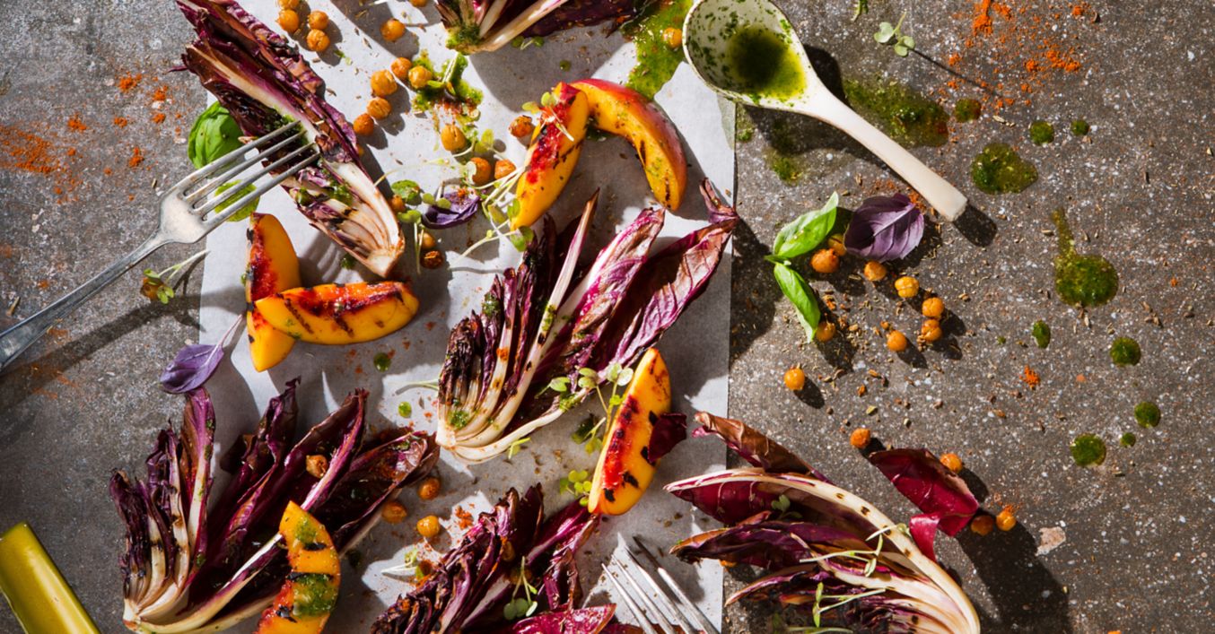 Radicchio se așază pe farfurii împreună cu nectarinele, se picură din belșug cu uleiul cu ierburi și se servesc cu năut crocant.
