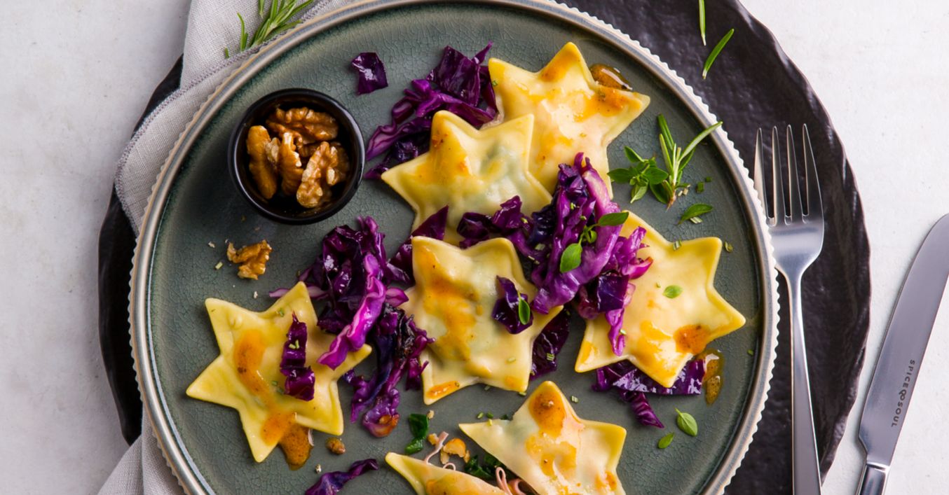 Ravioli cu mortadella, varză roșie și nuci